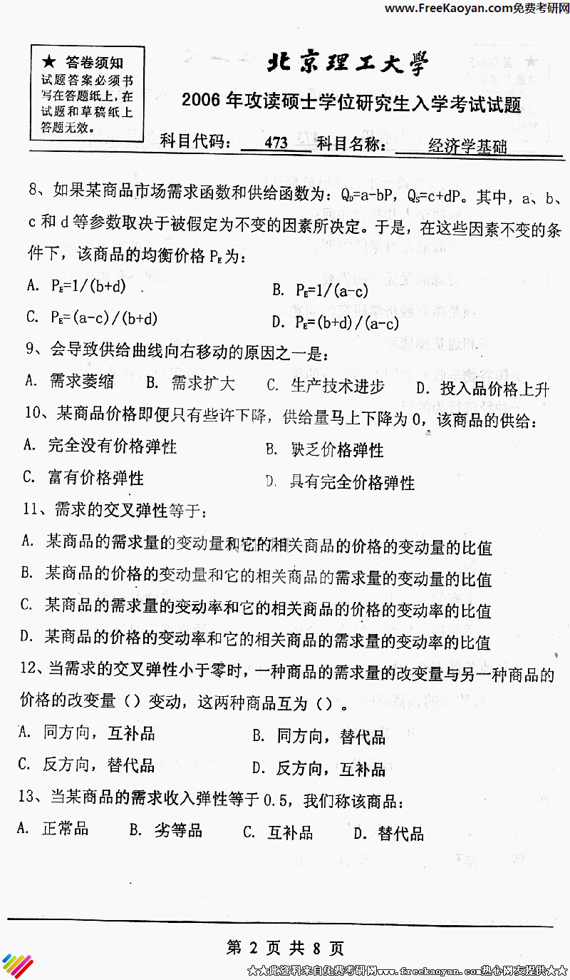 北京理工大学2006年考研真题-经济学基础(2)
