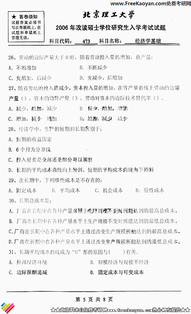 专业课考研经验 本站小编 FreeKaoyan 2018-01-22北京理工大学2005年考研真题-经济学基础