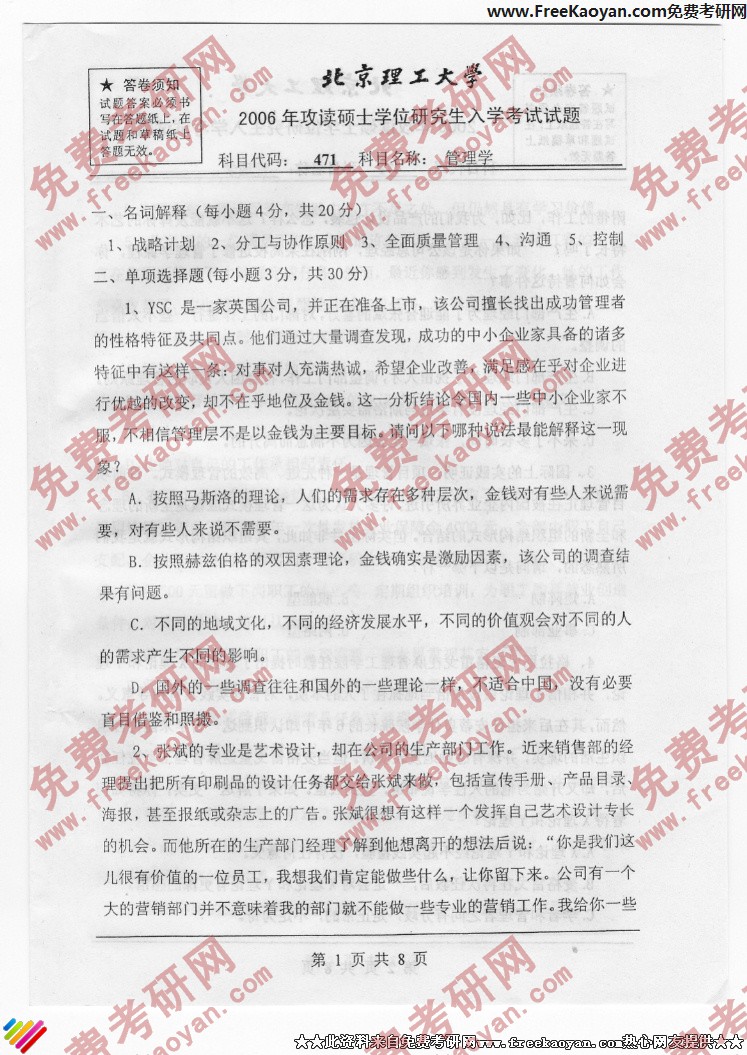 专业课考研经验 本站小编 FreeKaoyan 2018-01-22北京理工大学2005年考研真题-管理学基础