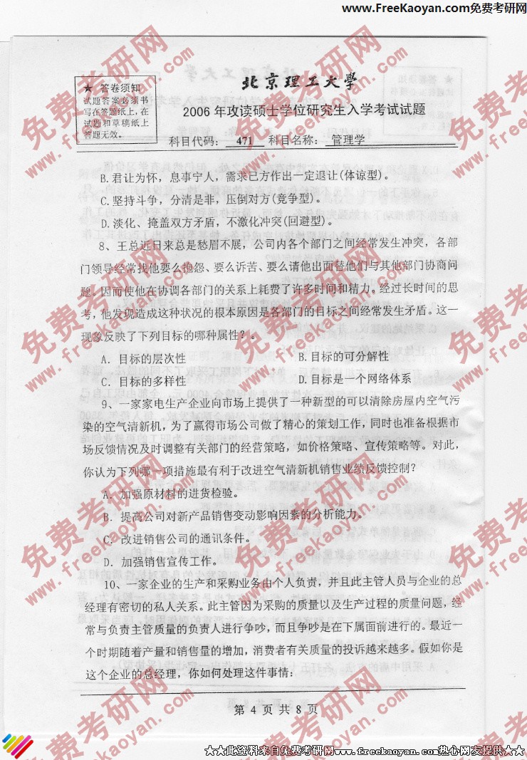 专业课考研经验 本站小编 FreeKaoyan 2018-01-22北京理工大学2005年考研真题-管理学基础