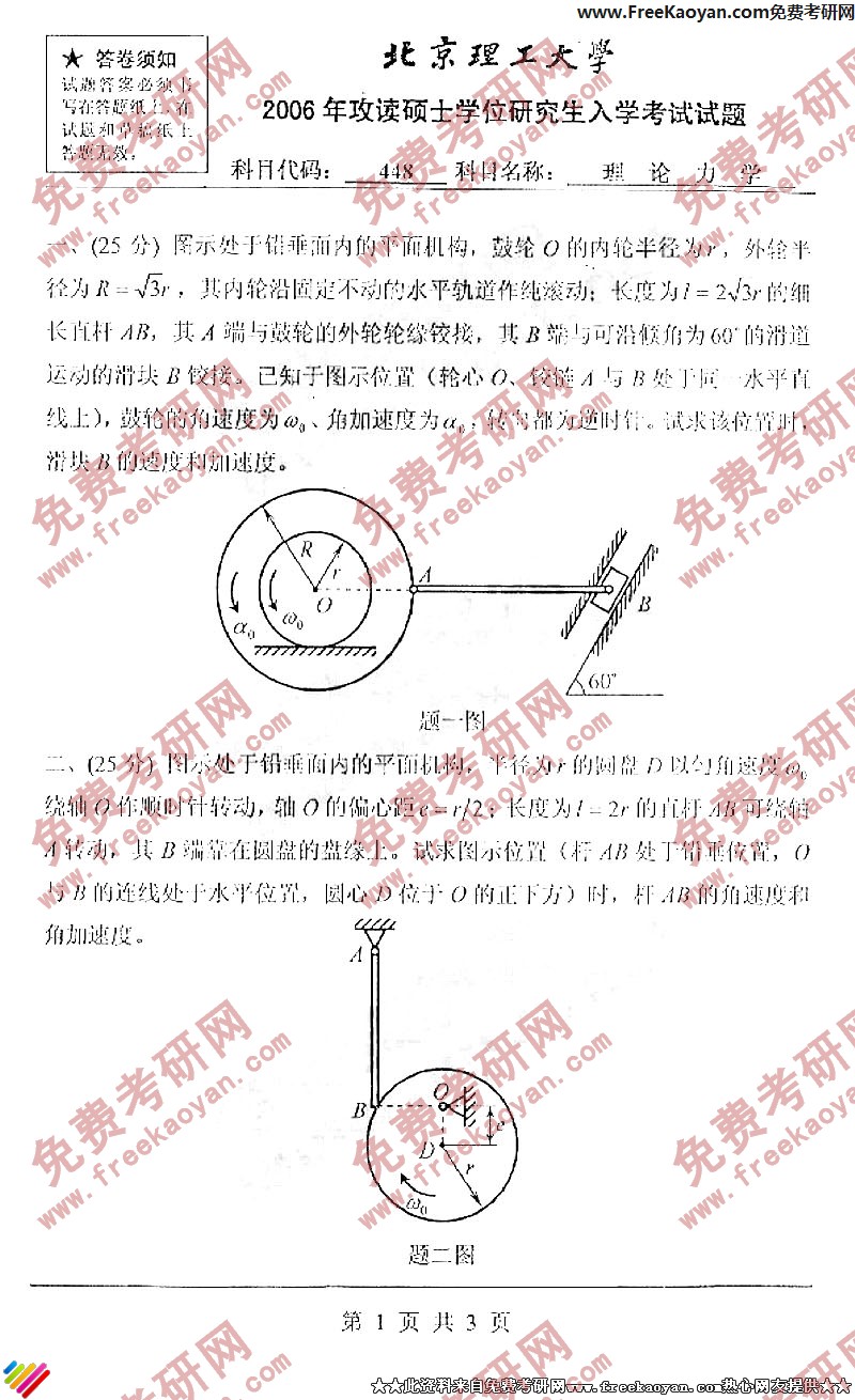 北京理工大学2006年考研真题-理论力学