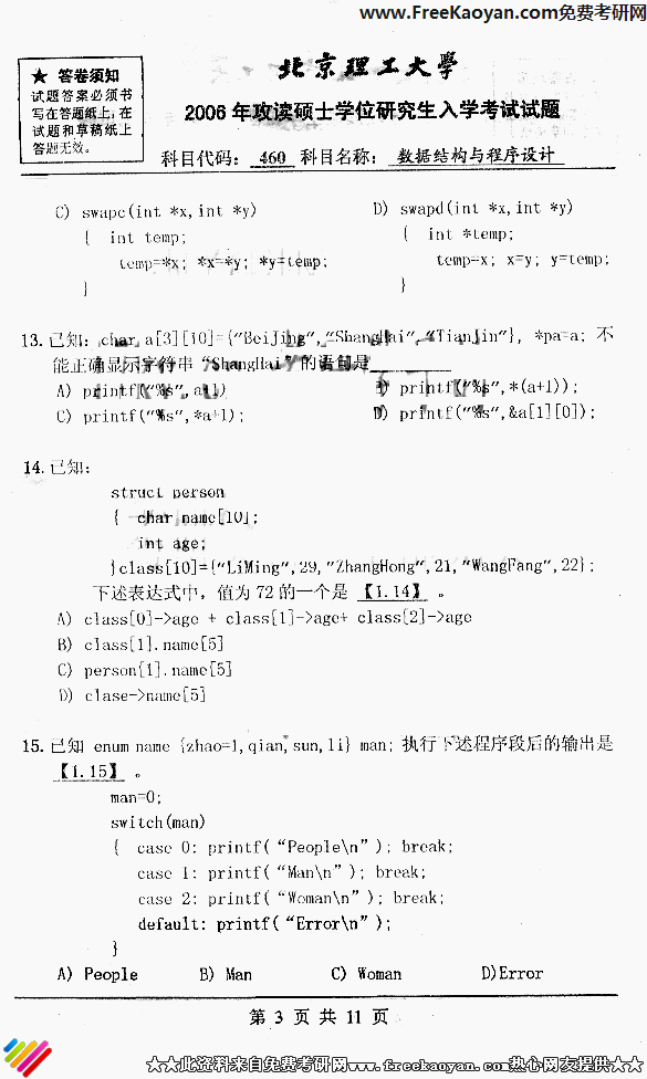 专业课考研经验 本站小编 FreeKaoyan 2018-01-22北京理工大学2006年考研真题-计算机技术基础(含计算机组成原理、操作系统和数据结构)