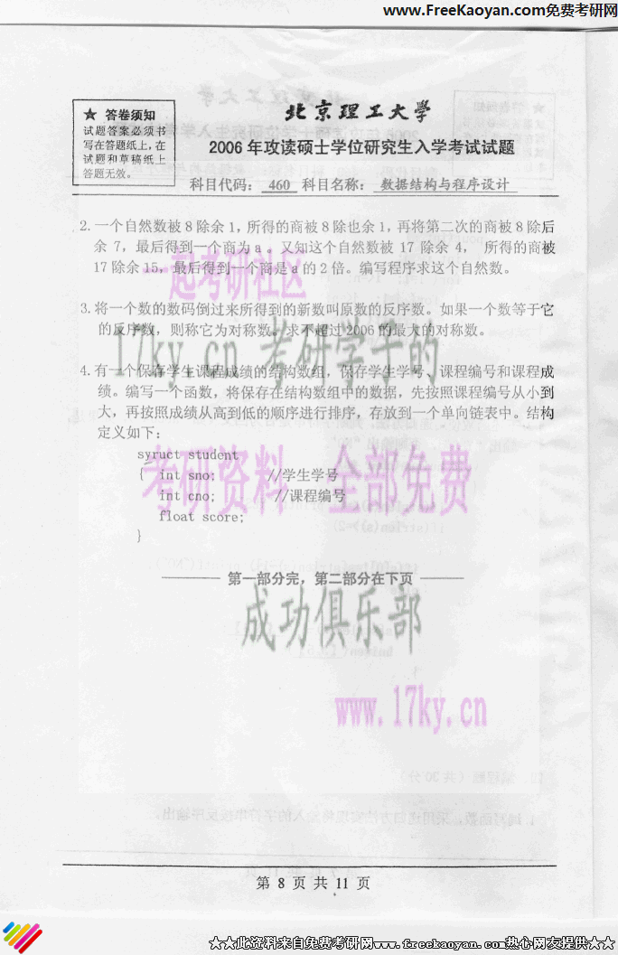 专业课考研经验 本站小编 FreeKaoyan 2018-01-22北京理工大学2006年考研真题-计算机技术基础(含计算机组成原理、操作系统和数据结构)