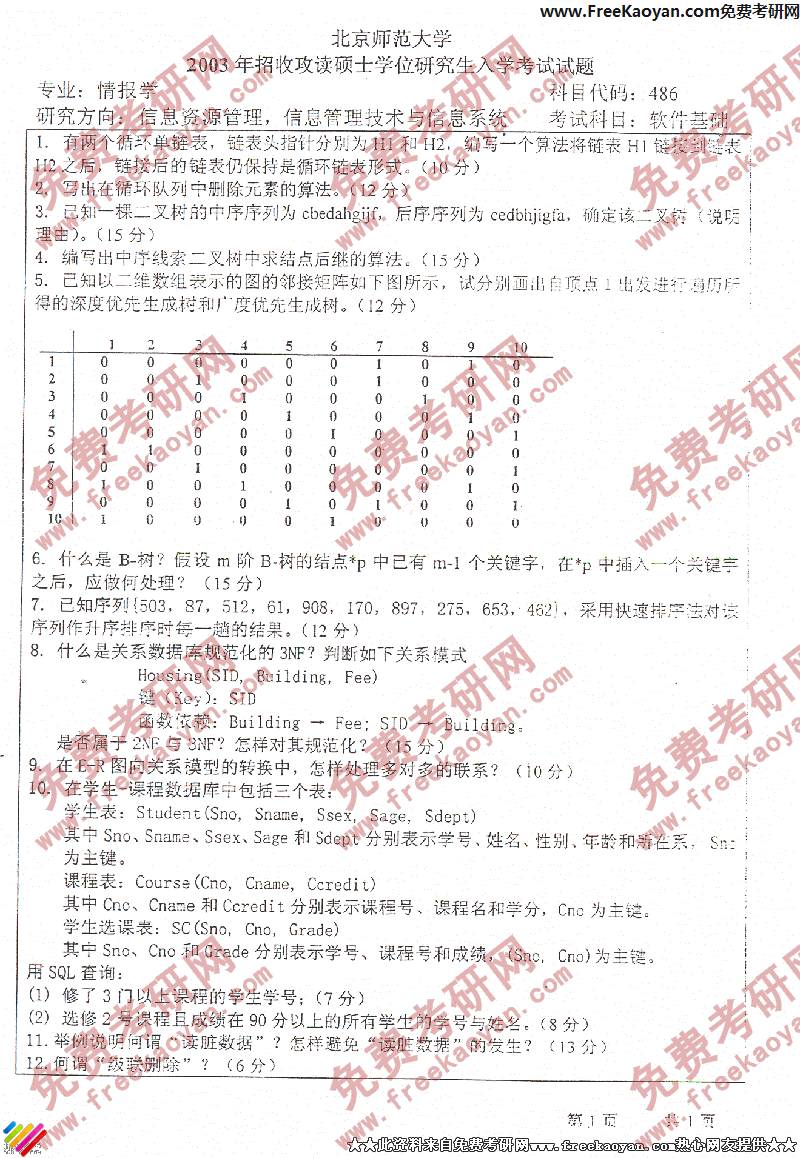 专业课考研经验 本站小编 FreeKaoyan 2018-01-22北京师范大学2000考研真题-数据结构试题与分析