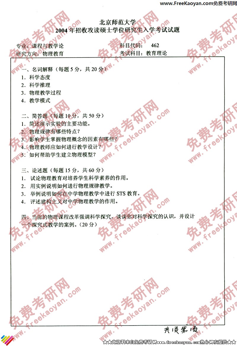 专业课考研经验 本站小编 FreeKaoyan 2018-01-22北京师范大学2004考研真题-固体物理