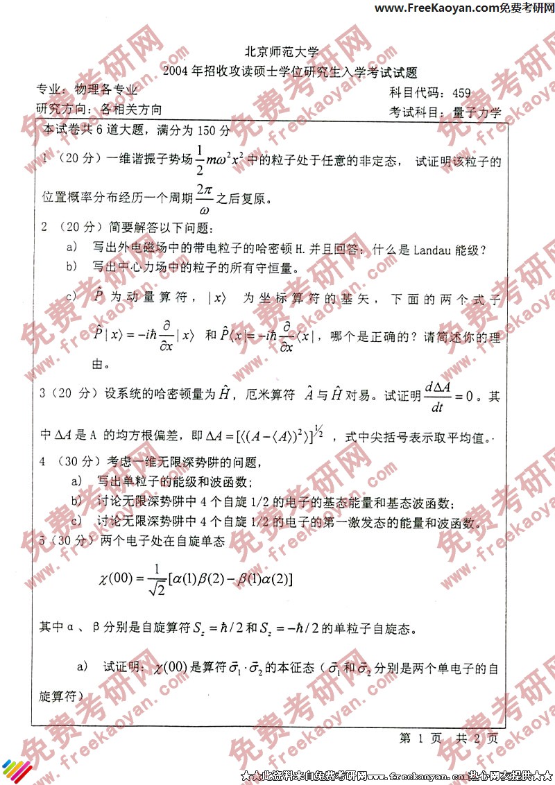 专业课考研经验 本站小编 FreeKaoyan 2018-01-22北京师范大学2004考研真题-固体物理