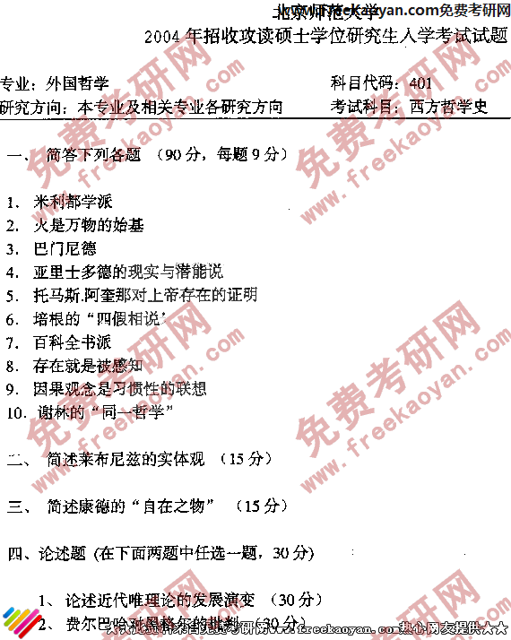 北京师范大学2004考研真题-西方哲学史