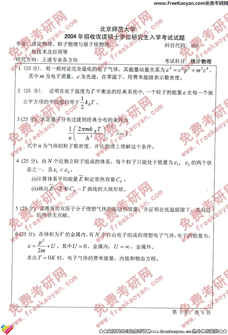 专业课考研经验 本站小编 FreeKaoyan 2018-01-22北京师范大学2004考研真题-固体物理