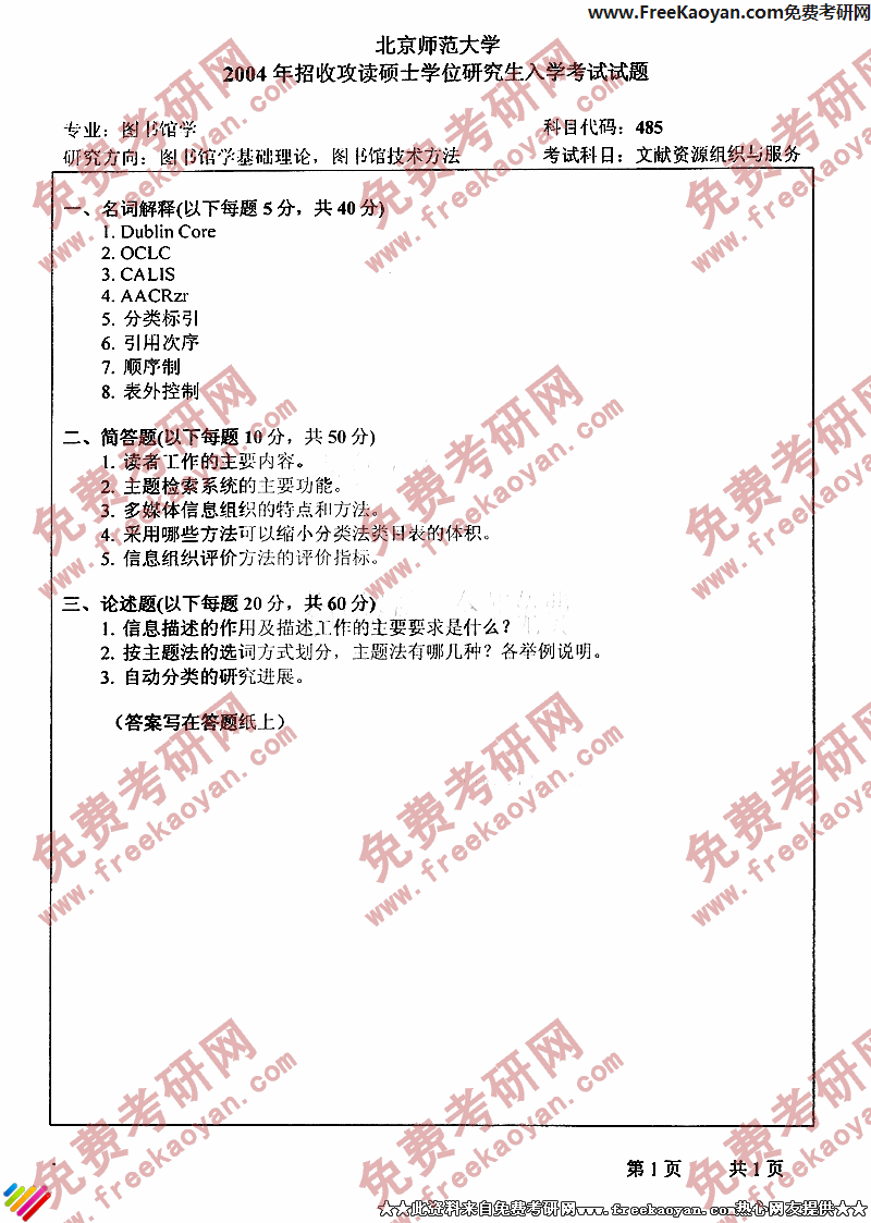 专业课考研经验 本站小编 FreeKaoyan 2018-01-22北京师范大学2004考研真题-图书馆学基础