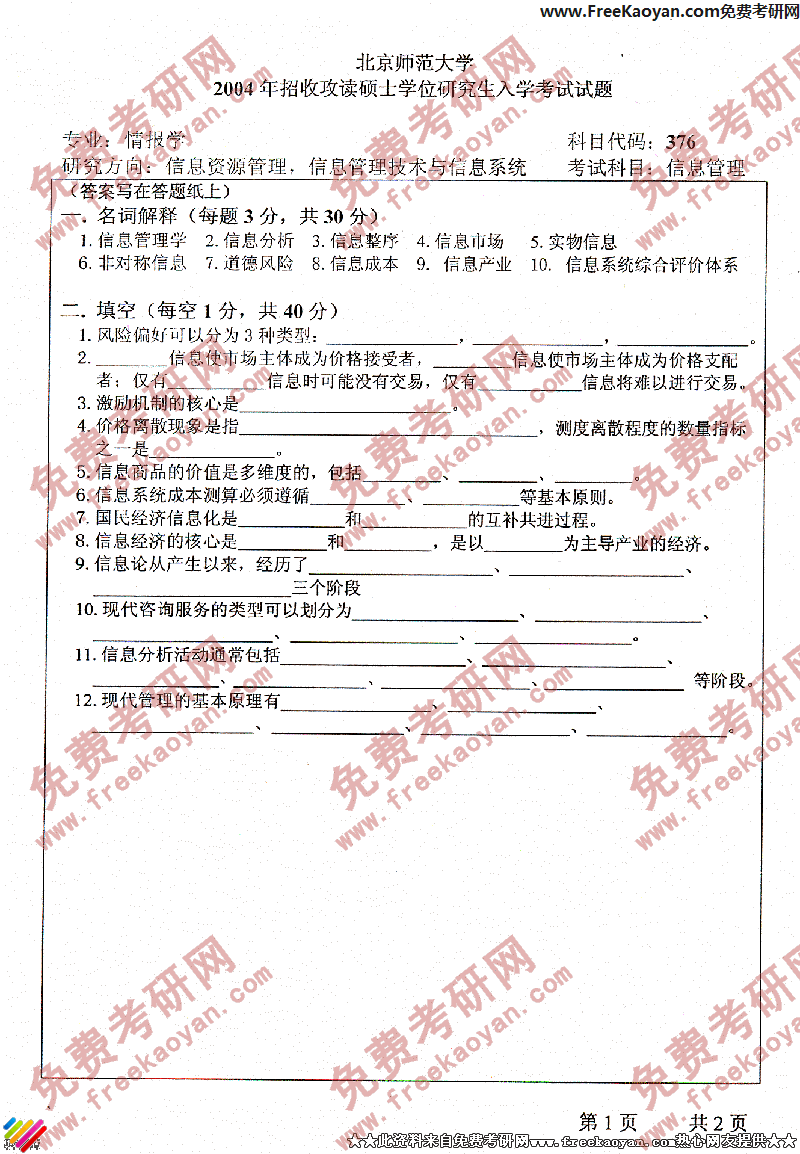专业课考研经验 本站小编 FreeKaoyan 2018-01-22北京师范大学2004考研真题-文献资源