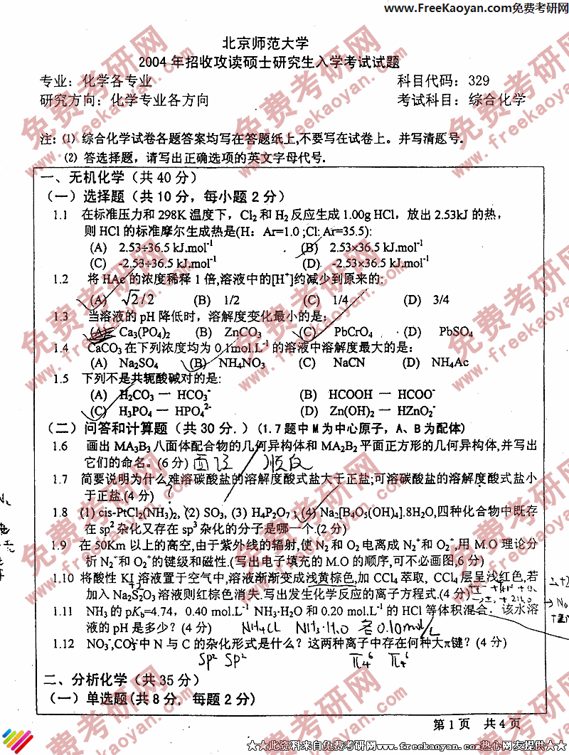 北京师范大学2004考研真题-综合化学