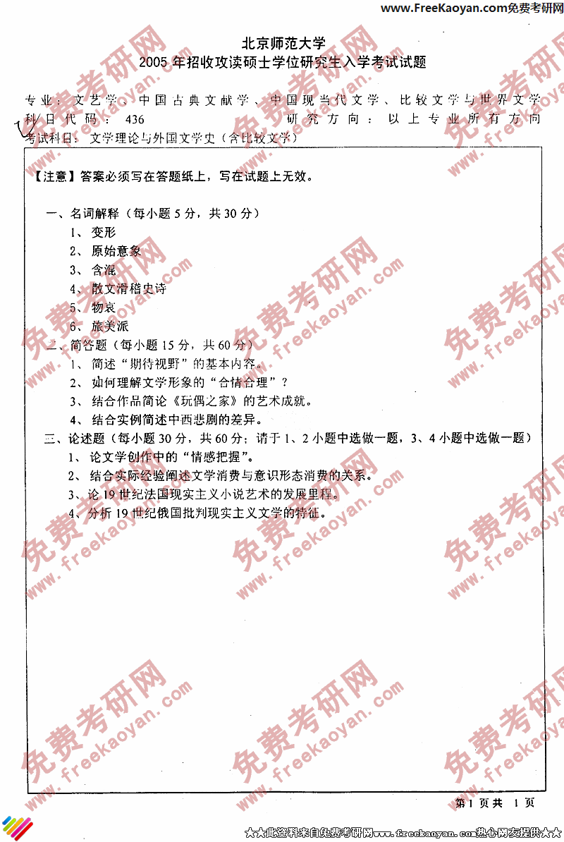 北京师范大学2005考研真题-文学理论与外国文学史(含比较文学)