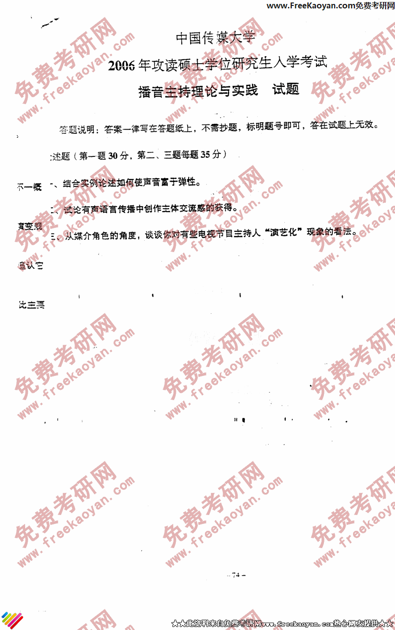 专业课考研经验 本站小编 FreeKaoyan 2018-01-22名词解释一个5分,简答一个10分,论述一个25分,今年的题比较偏 新闻理论部分 60分名词解释1。电波战 2。新闻理论 3。新闻事业简答1。媒介批评研究的背景2。社会主义新闻事业的性质,地位和作用论述关于 社会主义新闻事业的社会效益最高问题 新闻业务部分 30分名词解释1。新闻体裁 2。消息头简答1 ...