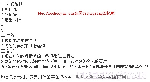 专业课考研经验 本站小编 FreeKaoyan 2018-01-22中国传媒大学(北广)考研历年真题专业课 2006年传播学试题一、名词解释 1、传播 2、知情权 3、媒介控制 4、不好意思,不记得了 5、格伯纳 二、简答 1、简述发展传播学的理论 2、简述文化研究学派代表人物和主要观点 三、论述 1、社会认同和阶层分化的社会心理和传播学原理是什 ...