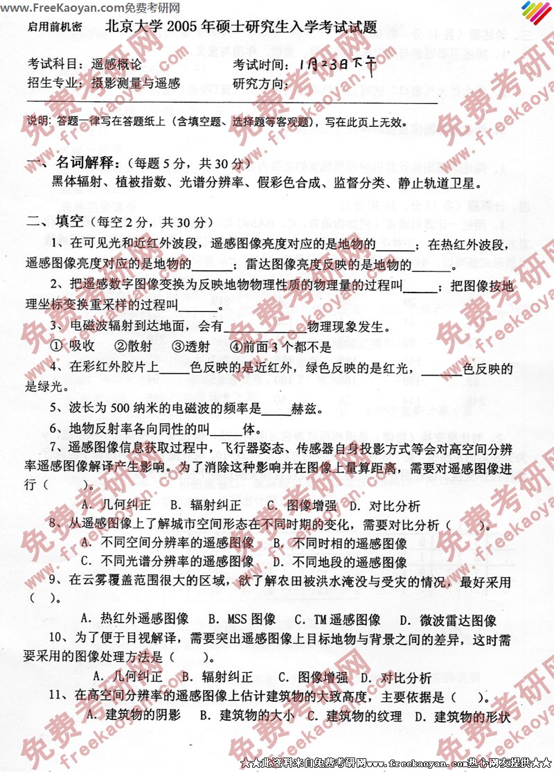 专业课考研经验 本站小编 FreeKaoyan 2018-01-22北京大学2003年考研真题-遥感概论