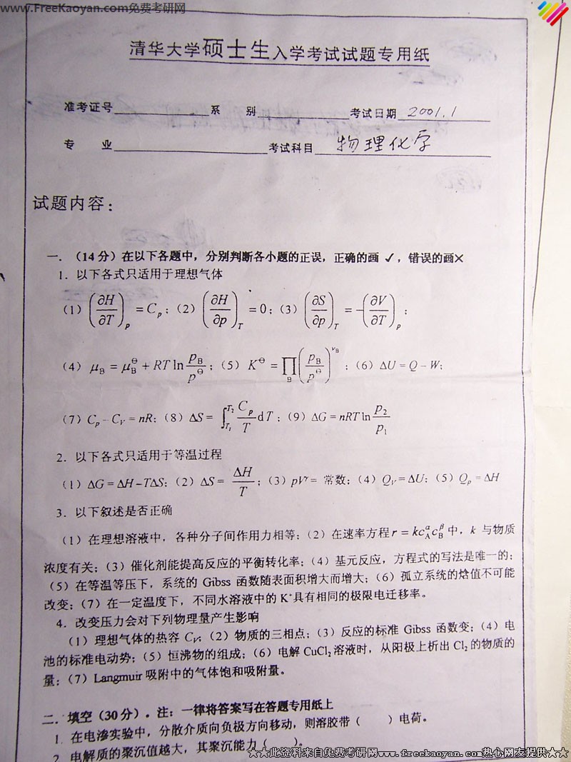 专业课考研经验 本站小编 FreeKaoyan 2018-01-22清华大学2000年考研真题-物理化学