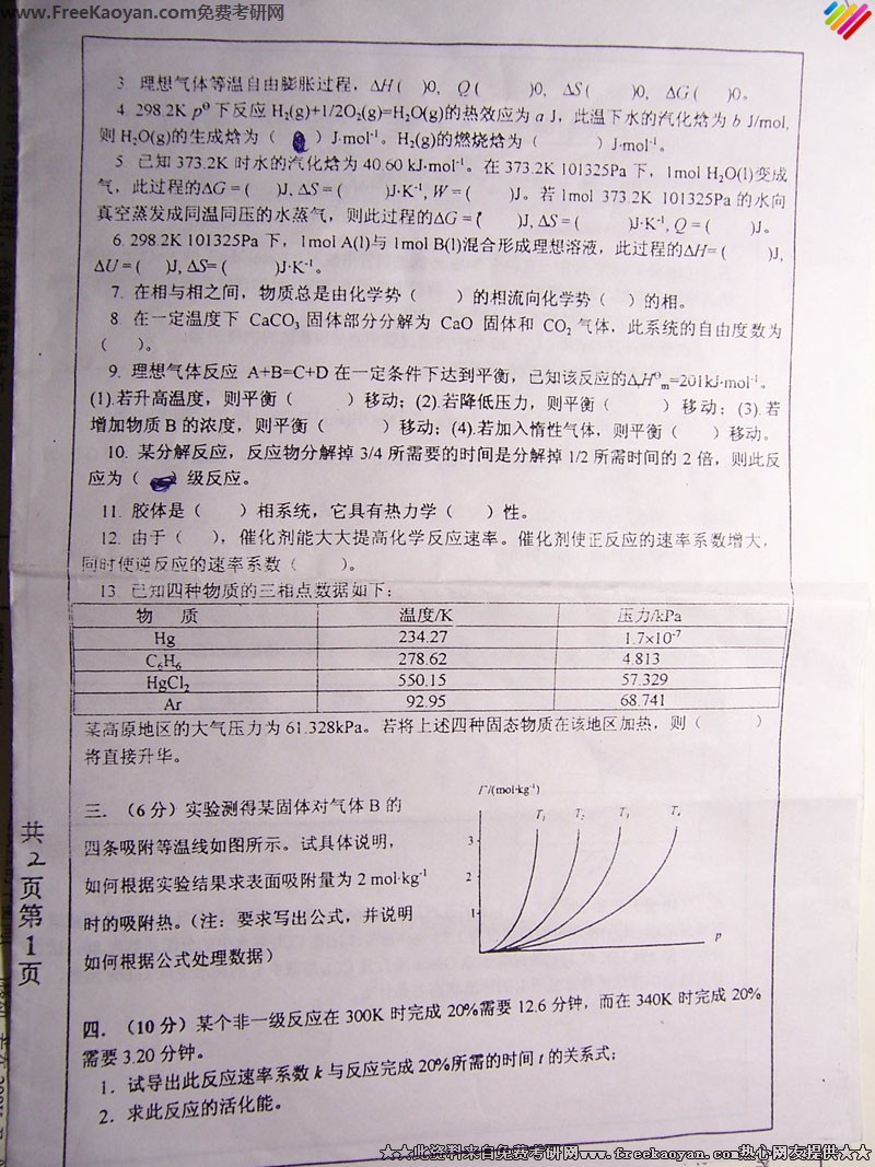 专业课考研经验 本站小编 FreeKaoyan 2018-01-22清华大学2000年考研真题-物理化学