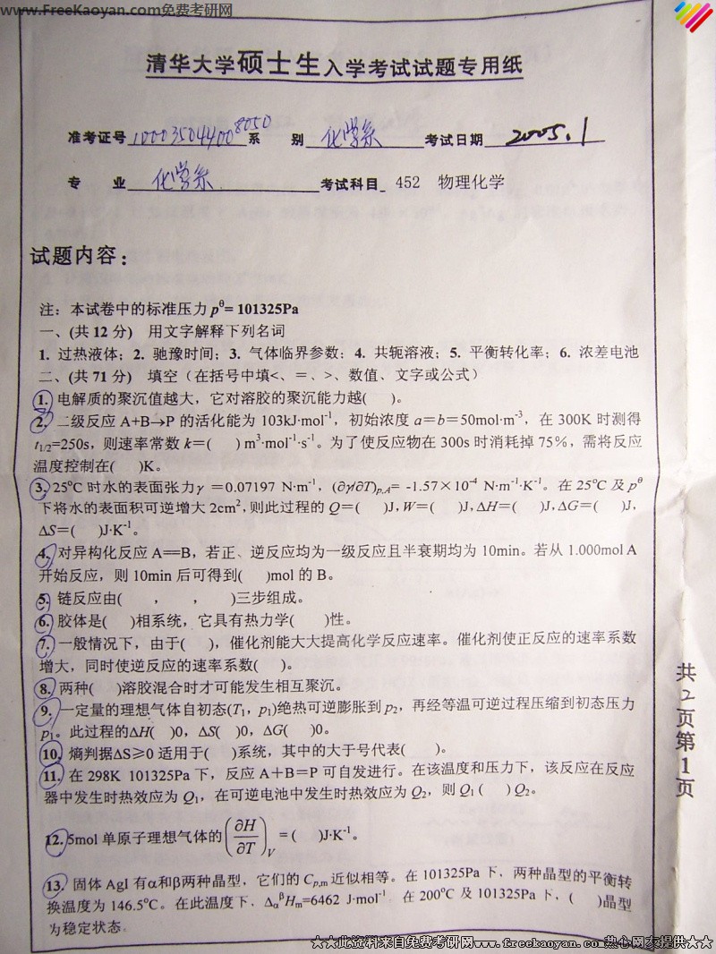 专业课考研经验 本站小编 FreeKaoyan 2018-01-22清华大学2001年考研真题-物理化学