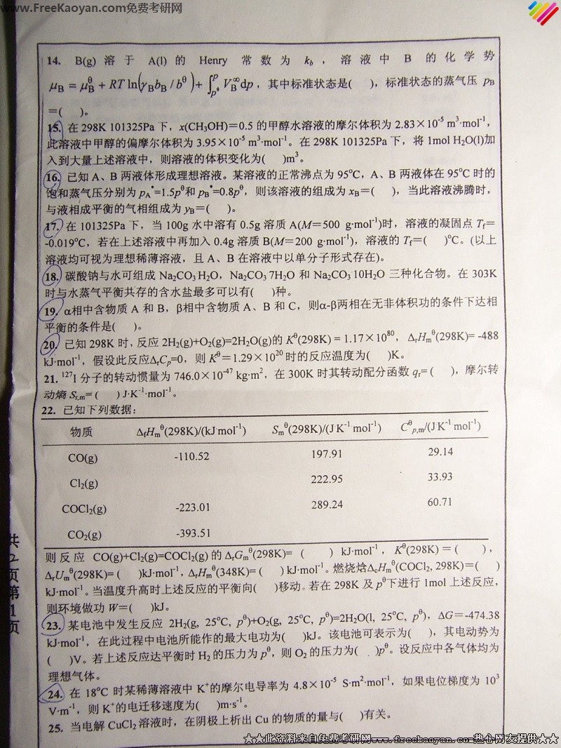 专业课考研经验 本站小编 FreeKaoyan 2018-01-22清华大学2000年考研真题-物理化学