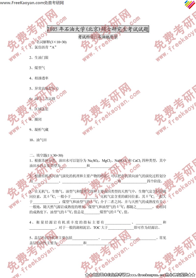 专业课考研经验 本站小编 FreeKaoyan 2018-01-22中国石油大学(北京)2003年考研真题-石油地质学