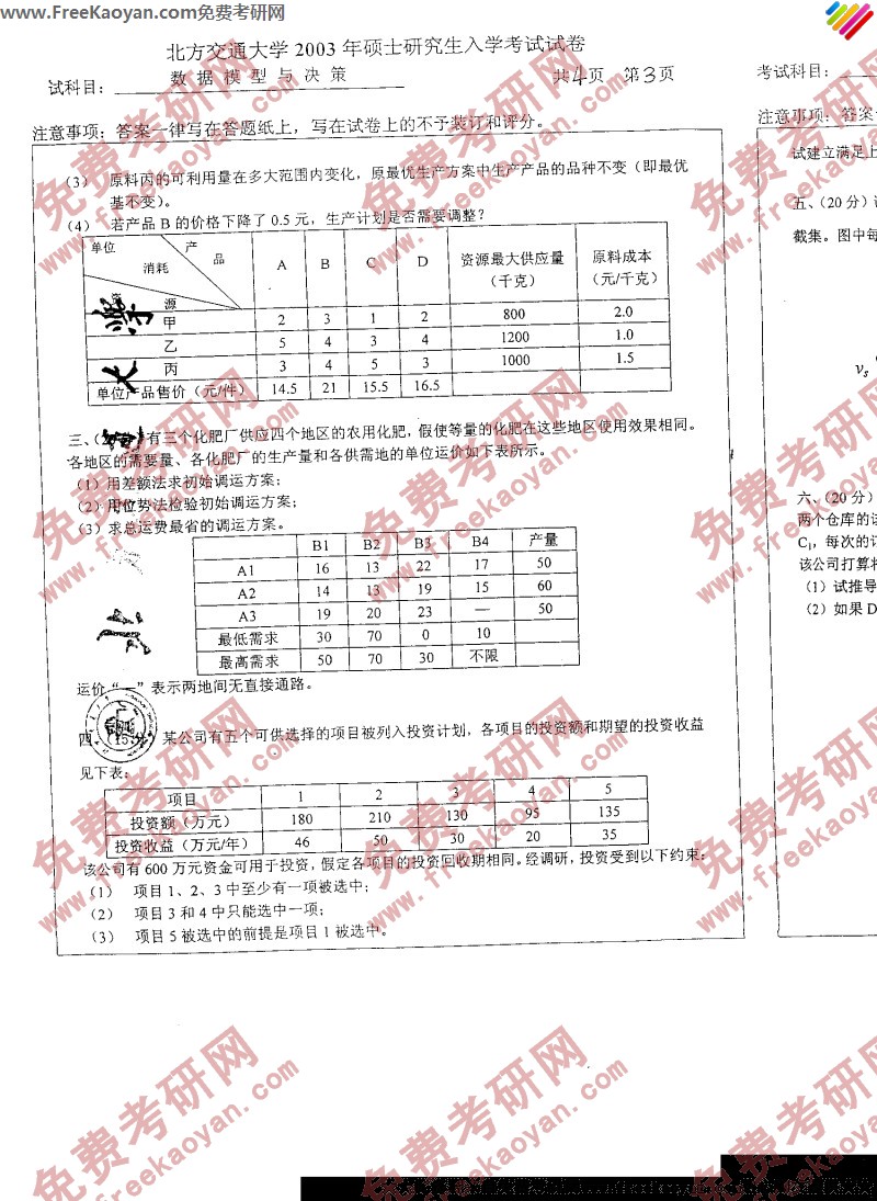 北京交通大学2003年考研真题-物流管理与工程数据模型与决策(3)
