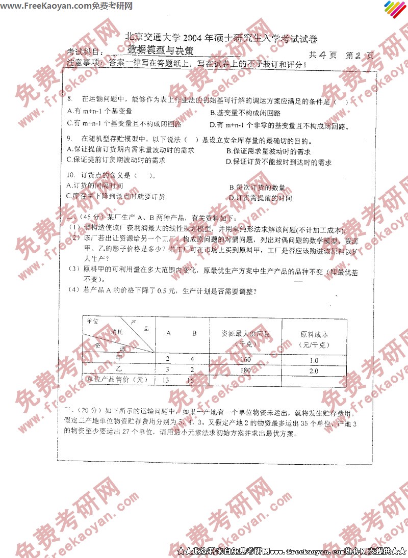 北京交通大学2004年考研真题-物流管理与工程数据模型与决策(2)