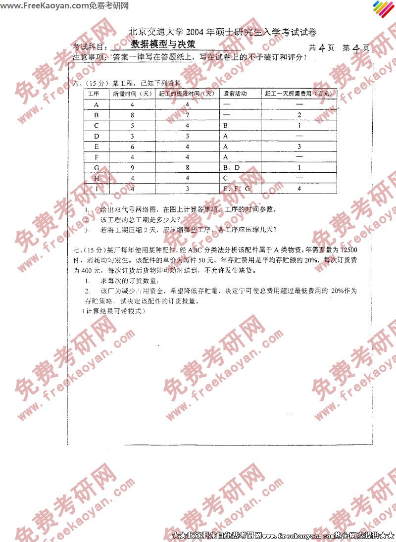 北京交通大学2004年考研真题-物流管理与工程数据模型与决策(4)