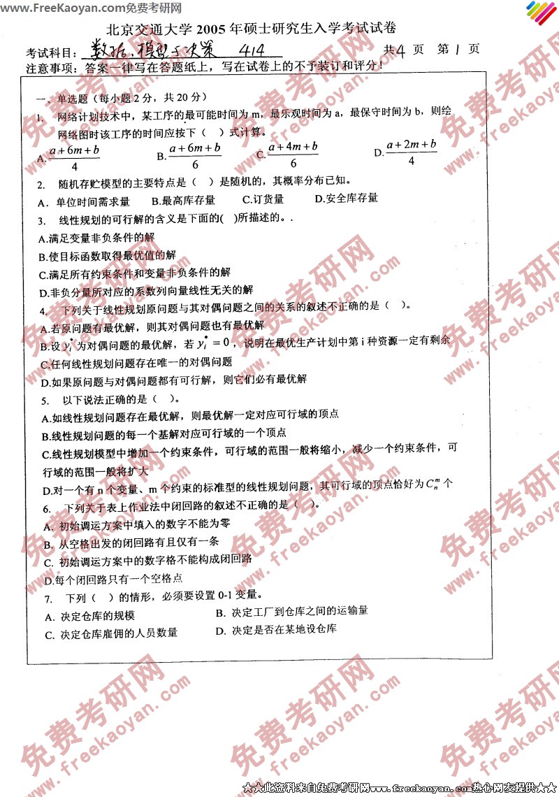 专业课考研经验 本站小编 FreeKaoyan 2018-01-23北京交通大学2004年考研真题-物流管理与工程数据模型与决策
