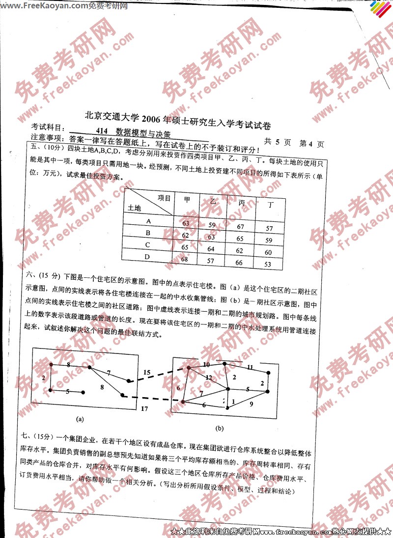 专业课考研经验 本站小编 FreeKaoyan 2018-01-23北京交通大学2005年考研真题-物流管理与工程数据模型与决策