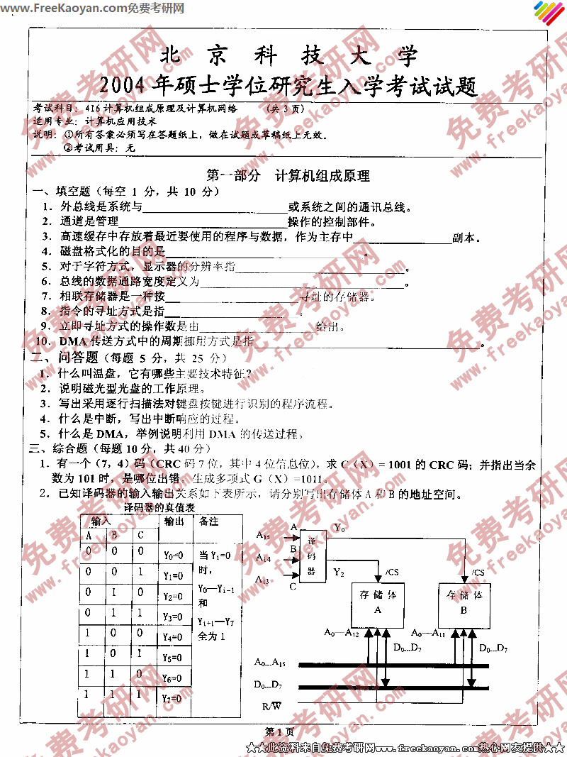北京科技大学2004年考研真题-计算机组成原理及计算机网络