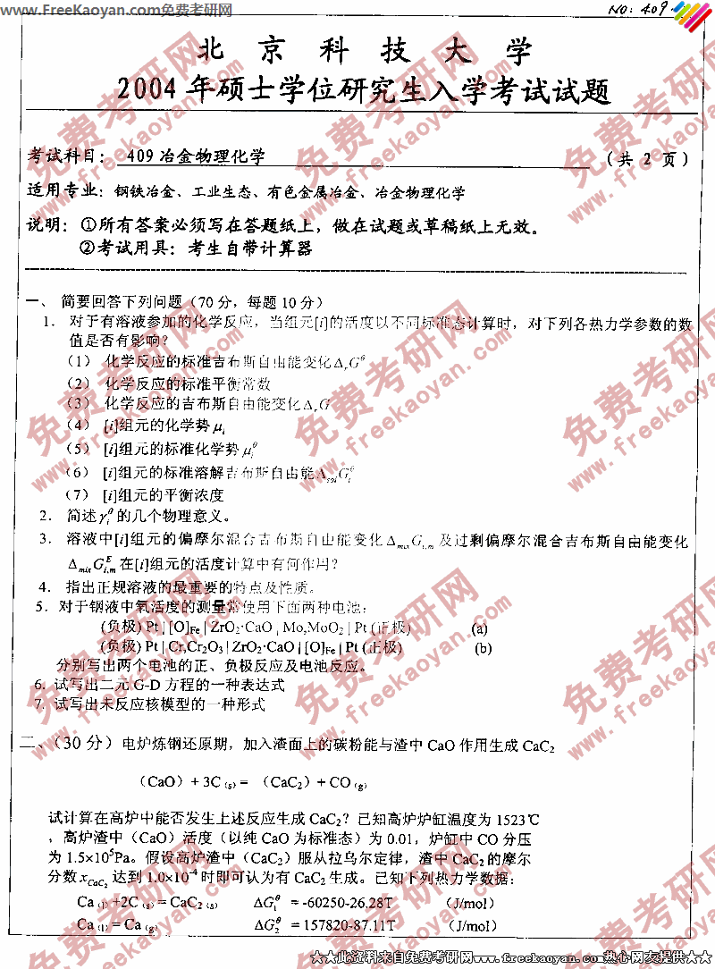 专业课考研经验 本站小编 FreeKaoyan 2018-01-23北京科技大学2003年考研真题-冶金物理化学