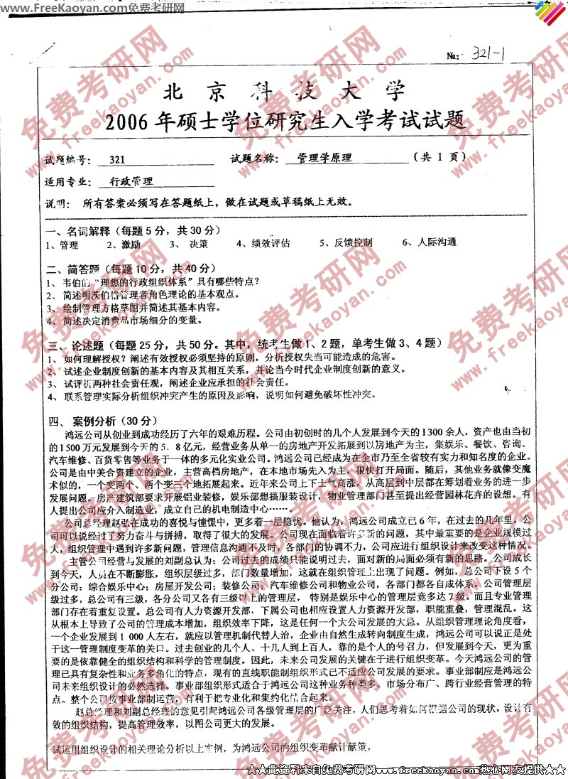 专业课考研经验 本站小编 FreeKaoyan 2018-01-23北京科技大学2005年考研真题-管理学原理