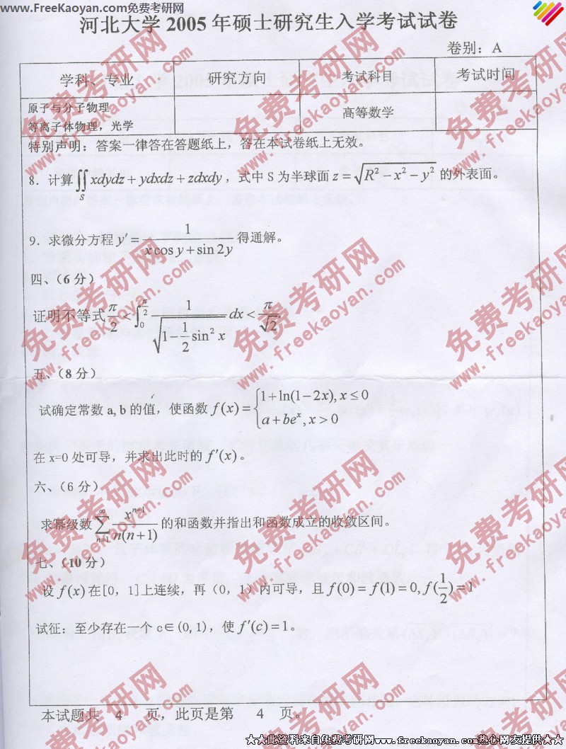 河北大学2005年考研真题-高等数学(等离子物理)(4)