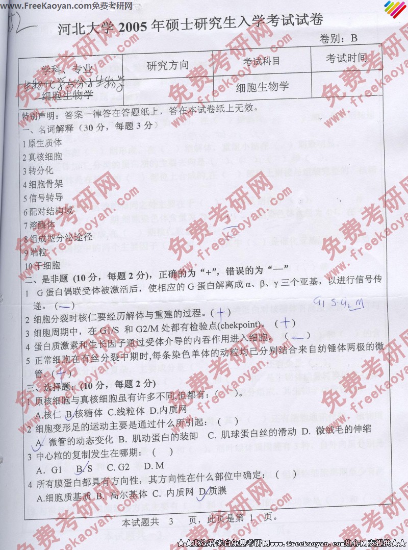 专业课考研经验 本站小编 FreeKaoyan 2018-01-23河北大学2005年考研真题-细胞生物学