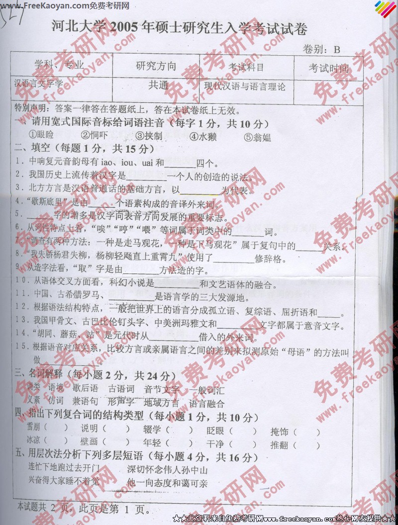 专业课考研经验 本站小编 FreeKaoyan 2018-01-23河北大学2005年考研真题-文史综合