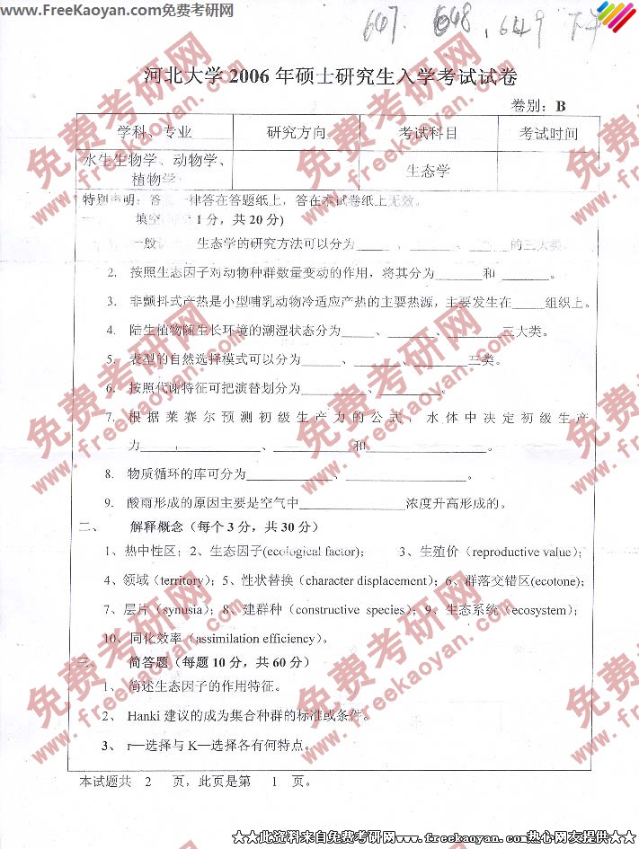 河北大学2006年考研真题-生态学