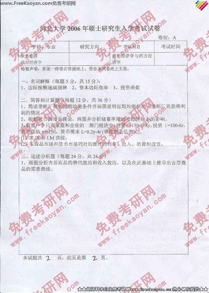 专业课考研经验 本站小编 FreeKaoyan 2018-01-23河北大学2006年考研真题-人口学理论