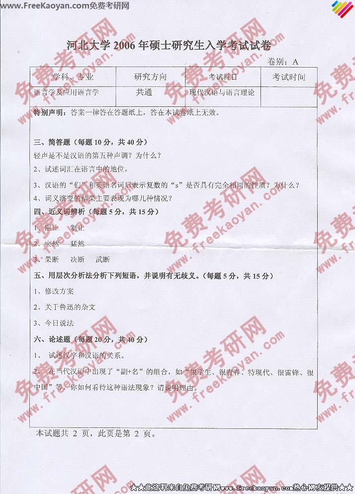 河北大学2006年考研真题-现代汉语与语言理论(2)