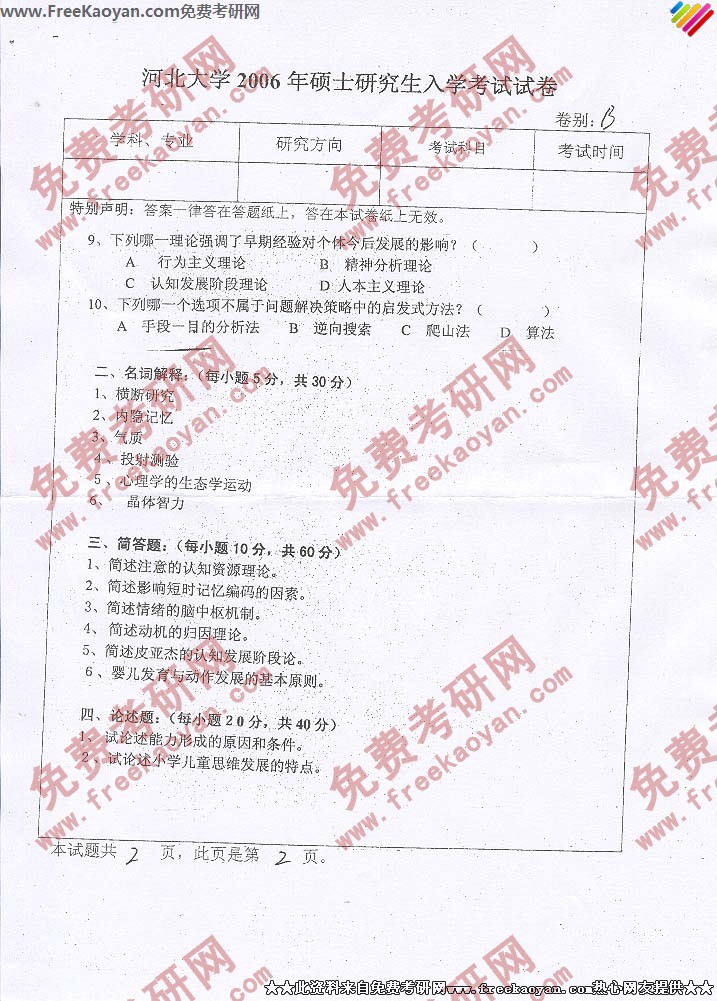 专业课考研经验 本站小编 FreeKaoyan 2018-01-23河北大学2006年考研真题-文史综合