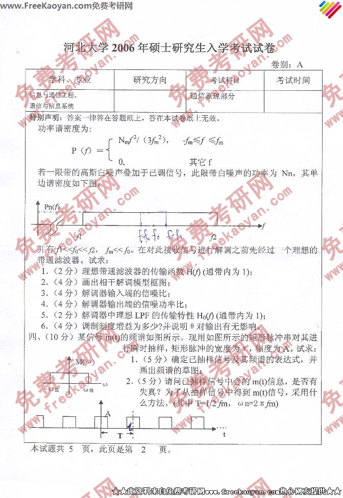 河北大学2006年考研真题-信号与系统通信原理(2)