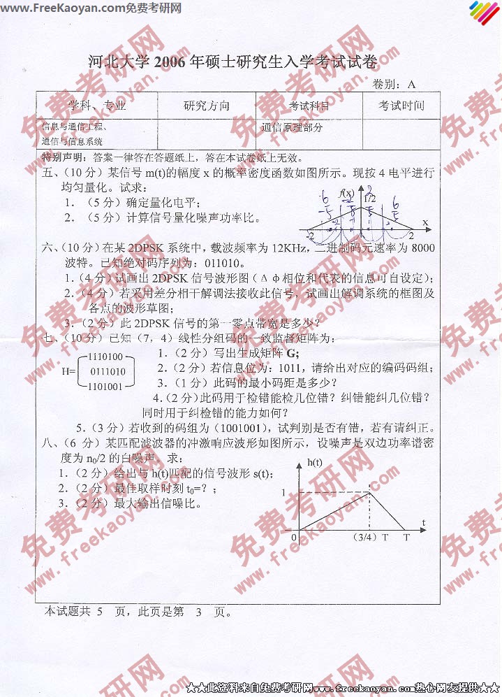 河北大学2006年考研真题-信号与系统通信原理(3)