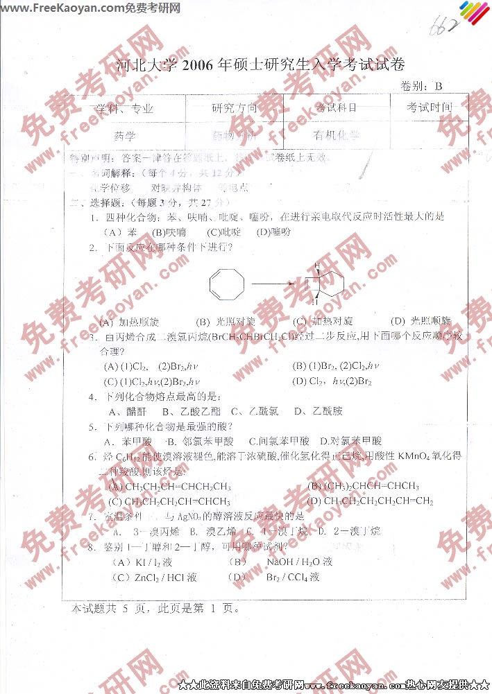 专业课考研经验 本站小编 FreeKaoyan 2018-01-23河北大学2006年考研真题-有机化学