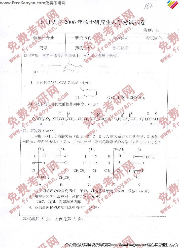 专业课考研经验 本站小编 FreeKaoyan 2018-01-23河北大学2006年考研真题-有机化学