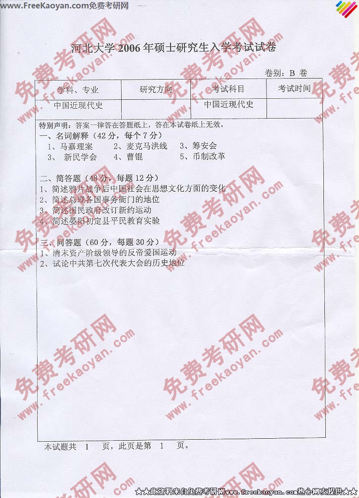 专业课考研经验 本站小编 FreeKaoyan 2018-01-23河北大学2006年考研真题-中国古代史
