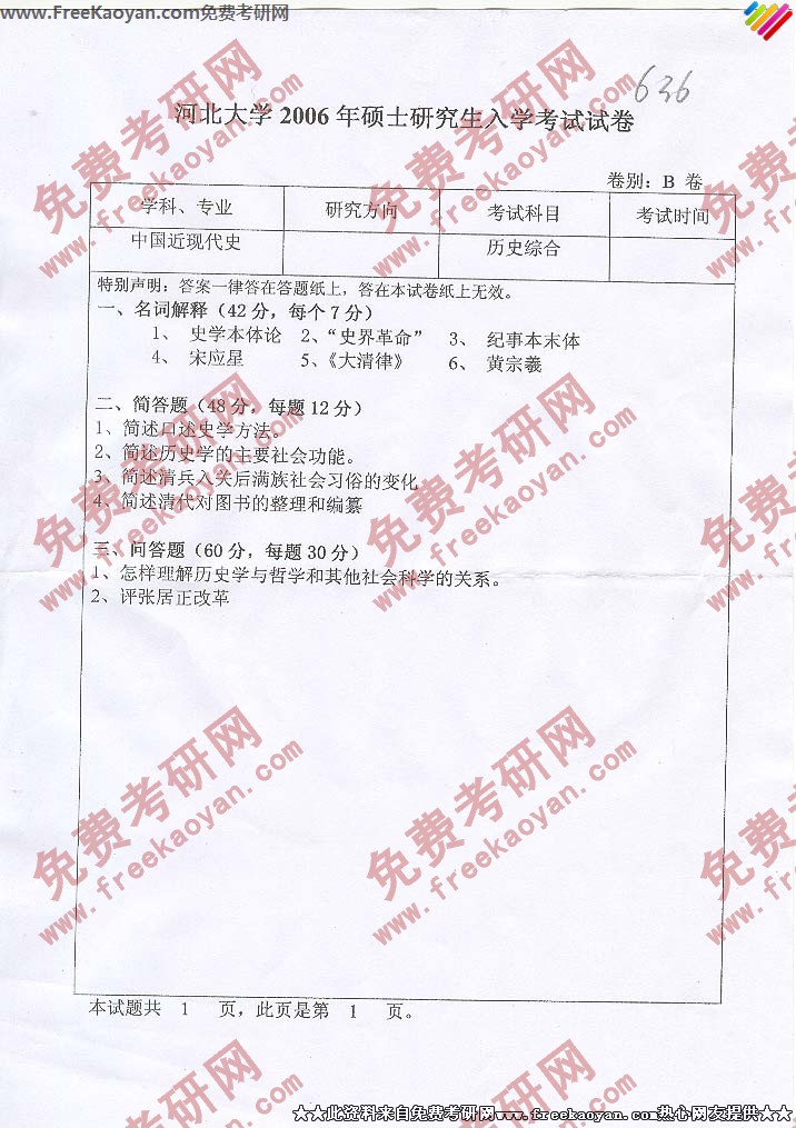 专业课考研经验 本站小编 FreeKaoyan 2018-01-23河北大学2006年考研真题-中国近现代史