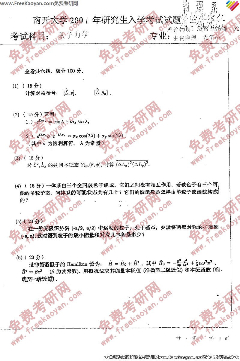 专业课考研经验 本站小编 FreeKaoyan 2018-01-23天津大学研究生院2002年招收硕士生入学试题题号:考试科目:化工原理(含实验) 页数:一、【基本题】(选择填空题或直接填空,每空1分,共25分)1、在完全湍流区,流动摩擦阻力损失与( )成正比;在层流区,流动摩擦阻力损失与( )成正比。①流速的一次方 ②流速的平方 ③流速的三次方 ④流速的五次方2、 ...