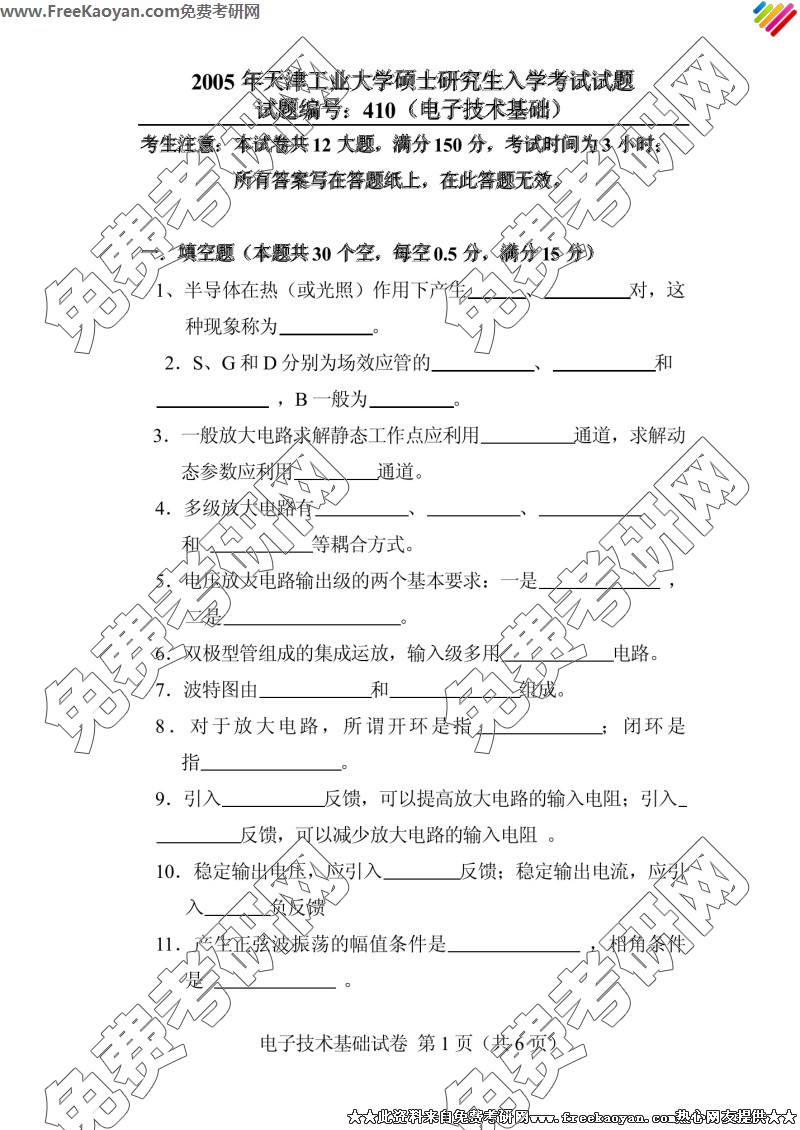 天津工业大学2005年考研真题-电子技术基础