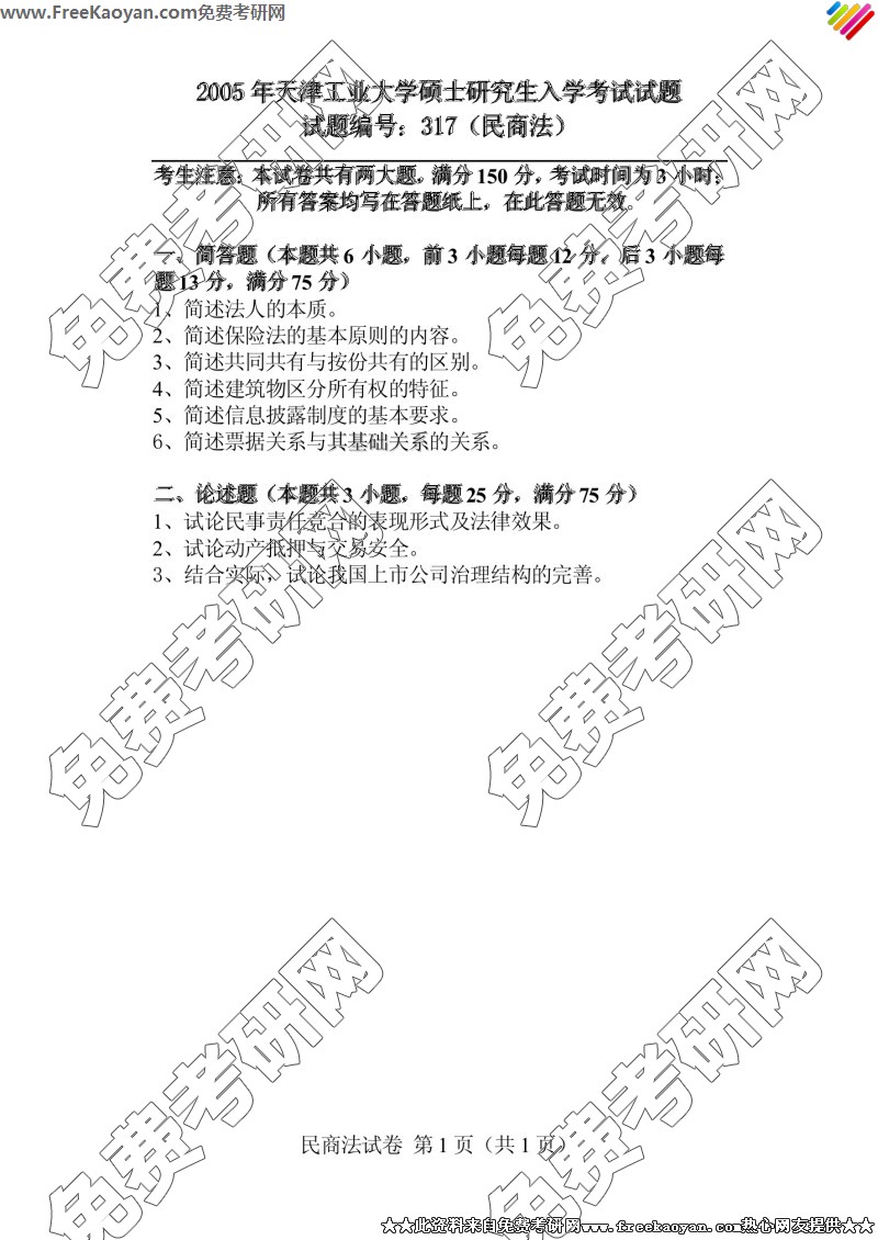 专业课考研经验 本站小编 FreeKaoyan 2018-01-23天津工业大学2005年考研真题-法学综合
