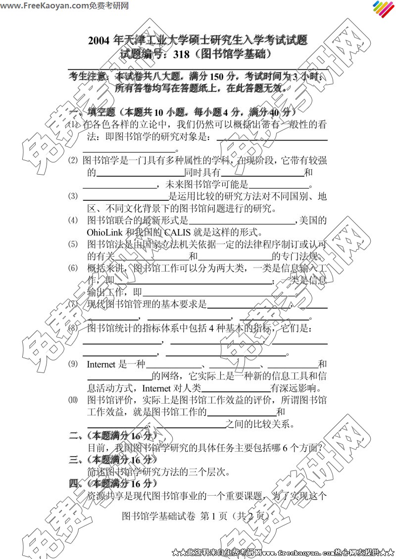 相关话题/考研真题 天津工业大学 基础 图书馆学
