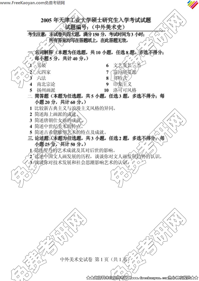 专业课考研经验 本站小编 FreeKaoyan 2018-01-23天津工业大学2005年考研真题-艺术设计史